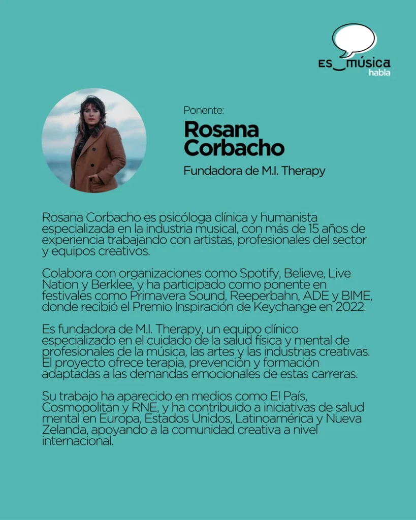 En este nuevo encuentro, contaremos con la participación de Rosana Corbacho (@m.i.therapy), con quien exploraremos los desafíos más comunes en materia de salud mental para quienes trabajan en los distintos ámbitos del sector musical